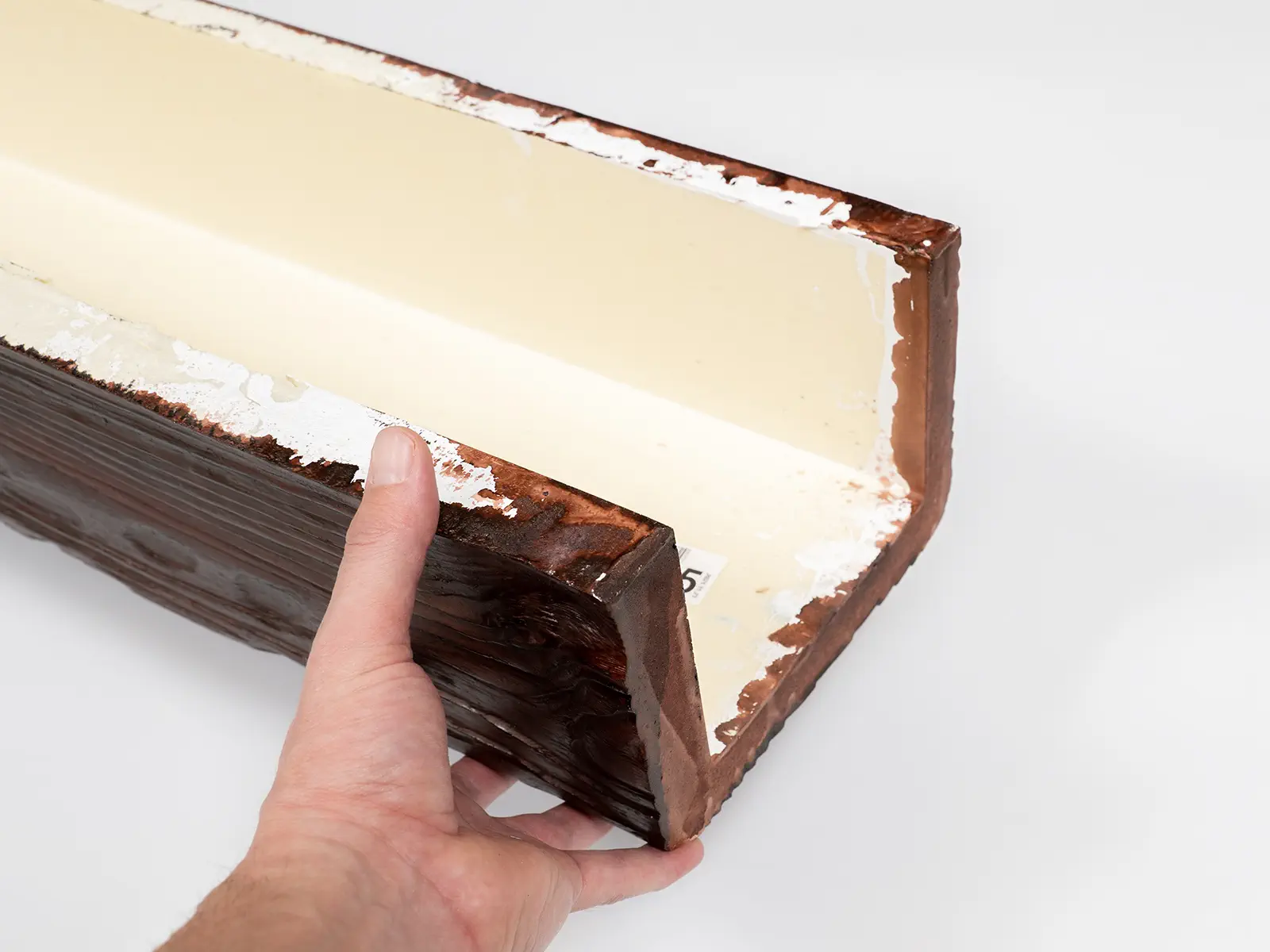 Grindă falsă din poliuretan rustic DecoWood EQ005, finisaj stejar roșu. Imitație lemn natural de stejar, greutate redusă, profil U pentru ascunderea cablurilor. Alternativă la lemnul masiv, ideală pentru tavan și pereți.